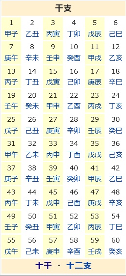 ちなみに数え年の61歳は、生まれた年の干支に戻るので、「暦が還(かえ)った」という意味で「還暦(かんれき)」といい、歳をとる正月には、公私ともに正式に隠居して長寿の祝いをした。この年齢に達すると親族などが赤い頭巾やちゃんちゃんこを贈るのは、もう一度赤ちゃんに戻って「生まれ直す」という意味合いをこめている。現在は、満60歳の誕生日や60周年に還暦の祝いをすることが多い。2周(120年)した場合は大還暦という。