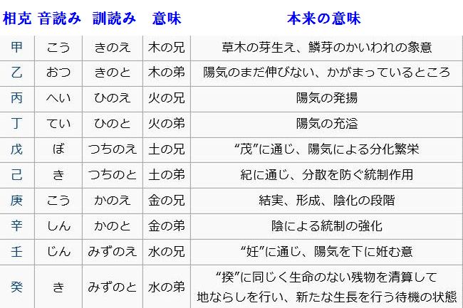 古代中国で考えられ、日本に伝えられた。十二支と合わせて干支(かんし、えと)といい、暦の表示などに用いられる。五行に当てはめて、2つずつを木(もく、き)・火(か、ひ)・土(と、つち)・金(こん、か)・水(すい、みず)にそれぞれ当て、さらに陰陽を割り当てている。日本では陽を兄、陰を弟として、例えば「甲」を「木の兄」(きのえ)、「乙」を「木の弟」(きのと)などと呼ぶようになった。「干支」を「えと」と読むのは、この「兄弟」(えと)に由来する。